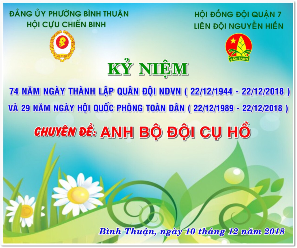Sáng thứ Hai ngày 10/12/2018 tại sân trường trường THCS Nguyễn Hiền, Hội cựu chiến binh phường Bình Thuận và Liên Đội trường Trung học cơ sở Nguyễn Hiền đã tổ chức buổi sinh hoạt kỷ niệm 74 năm ngày thành lập Quân đội nhân dân Việt Nam (22/12/1944 - 22/12/2018) và kỷ niệm 29 năm ngày Hội Quốc phòng toàn dân (22/12/1989-22/12/2018)
