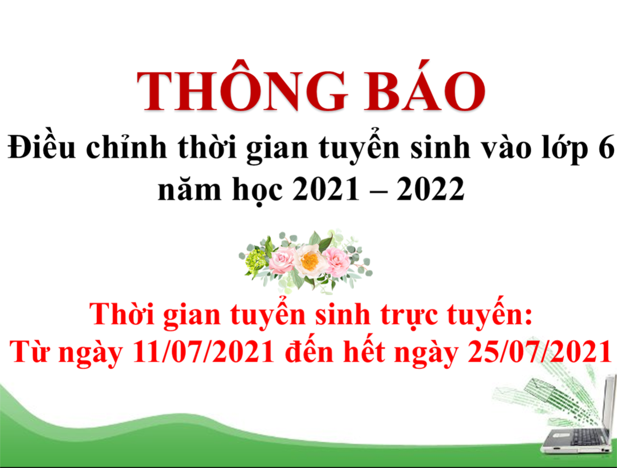Trường THCS Nguyễn Hiền điều chỉnh thời gian tuyển sinh trực tuyến vào lớp 6 năm học 2021 - 2022 từ ngày 11/07/2021 đến hết ngày 25/07/2021. Sau thời gian này, nhà trường không chịu trách nhiệm giải quyết các trường hợp trễ hạn.