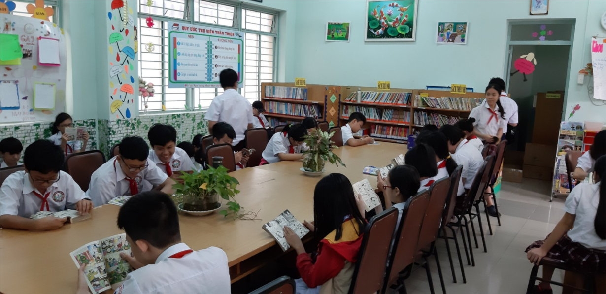 Với vai trò là trái tim của trường học, hiện nay thư viện học đang được các trường chú trọng đầu tư và đổi mới hoạt động nhằm tạo sức hấp dẫn với học sinh. Từ năm học 2017-2018, Trường Trung học cơ sở Nguyễn Hiền (Quận 7) đã xây dựng kế hoạch phát triển thư viện thành “Trái tim của nhà trường”. Theo đó, trường tập trung đầu tư trang thiết bị, trang bị các đầu sách mới, đa dạng hóa hoạt động giới thiệu sách nhằm thu hút học sinh. Đặc biệt, Tổ Ngữ văn của trường đã tổ chức các tiết đọc sách cho học sinh các khối lớp tại thư viện với 1 tiết trong tháng. Đây là một hoạt động trải nghiệm mới mẻ, đưa tiết học ra ngoài không gian lớp học, đa dạng hóa hoạt động học tập, phong phú kiến thức tiếp nhận ngoài sách giáo khoa.